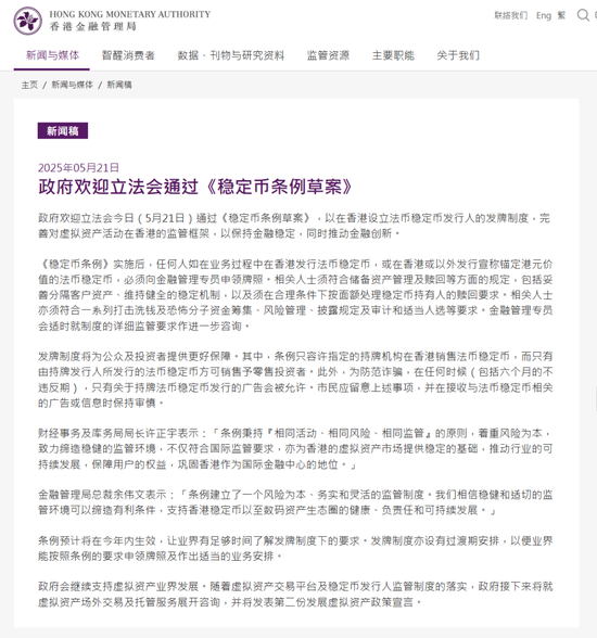 中国香港立法会则于5月21日通过《稳定币条例草案》,预计于8月1日正式生效。届时,香港金融管理局(以下简称“香港金管局”)将开始接受牌照申请。